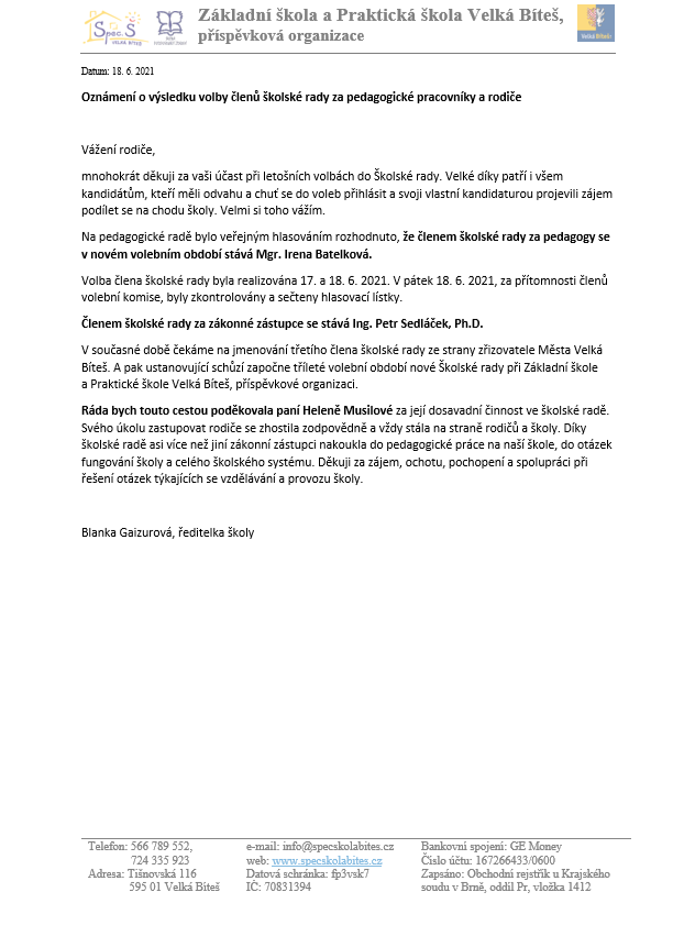 Na pedagogické radě bylo veřejným hlasováním rozhodnuto, že členem školské rady za pedagogy se v novém volebním období stává Mgr. Irena Batelková.